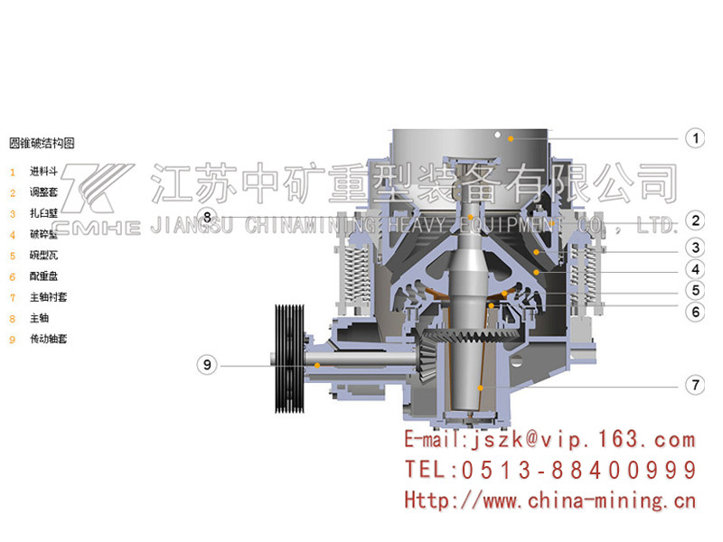 圓錐破碎機工作時,電動機的旋轉通過皮帶輪或聯軸器、圓錐破碎機傳動軸和圓錐破碎機圓錐部在偏心套的迫動下繞一周固定點作旋擺運動。從而使破碎圓錐的破碎壁時而靠近又時而離開固裝在調整套上的軋臼壁表面,使礦石在破碎腔內不斷受到沖擊,擠壓和彎曲作用而實現礦石的破碎。電動機通過傘齒輪驅動偏心套轉動,使破碎錐作旋擺運動。破碎錐時而靠近又時而離開固定錐,完成破碎和排料。支撐套與架體連接處靠彈簧壓緊,當破碎機內落入金屬塊等不可破碎物體時,彈簧即產生壓縮變形,排出異物,實現保險,防止機器損壞。圓錐式破碎機在不可破異物通過破碎腔或因某種原因機器超載時,圓錐式破碎機彈簧保險系統實現保險,圓錐式破碎機排礦口增大。異物從圓錐破碎機破碎腔排出,如異物卡在排礦石可使用清腔系統,使排礦繼續增大,使異物排出圓錐破碎機破碎腔。圓錐破碎機在彈簧的作用下,排礦口自動復位,圓錐式破碎機機器恢復正常工作。破碎腔表面鋪有耐磨高錳鋼襯板。排礦口大小采用液壓或手動進行調整。