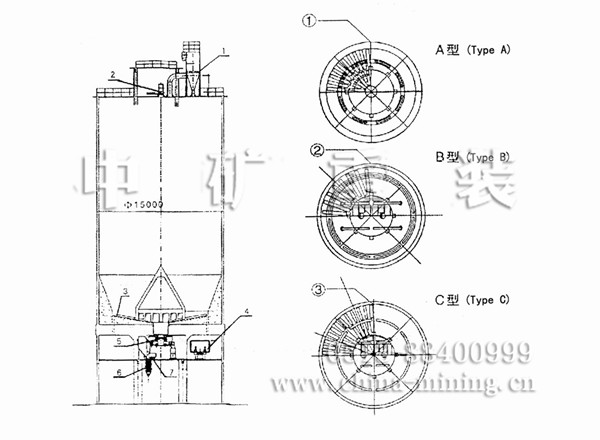 水泥儲存庫是在庫底中心位置設(shè)一錐形混合室,以降低庫內(nèi)的卸料壓力,消除漏斗流。混合室 設(shè)8~12個進料孔,在混合室和庫壁之間的環(huán)形區(qū)設(shè)有8~12個充氣區(qū),卸料時輪流向相對的環(huán)形小 區(qū)充氣,使部分水泥流向中心混合室。在自上而下的流動過程中,切割水平料層而產(chǎn)生重力混合作 用,進入混合室后又因混合室內(nèi)的連續(xù)充氣攪拌而進一步均化。這種庫的均化值可達5~9。電耗 0.15~0. 30kwh / t.