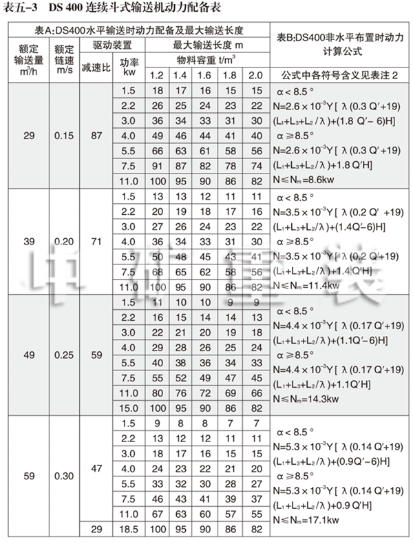 1、DS 400連續(xù)斗式輸送機(jī)動(dòng)力配備表